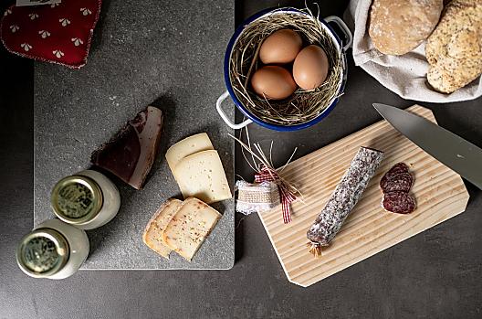 Producten van de boerderij: eieren, vruchtenspreads, kruiden ...