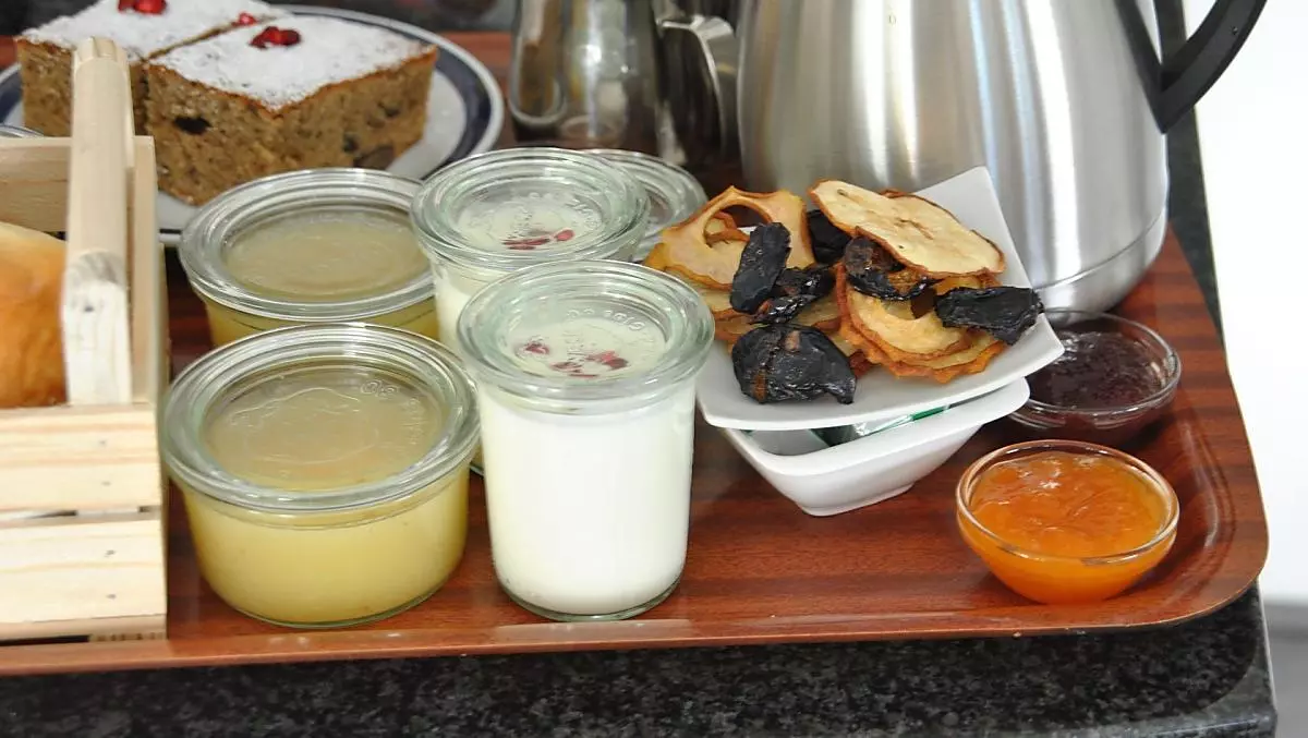 - Boerderijproducten bij het ontbijt: eieren, vruchtenspreads, siroop, vruchtensappen, gedroogd fruit, chutney, pickles, kruidenthee, brood en banket, verse groenten van het seizoen, vers fruit naargelang het seizoen