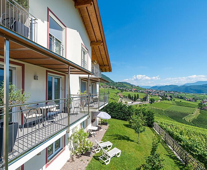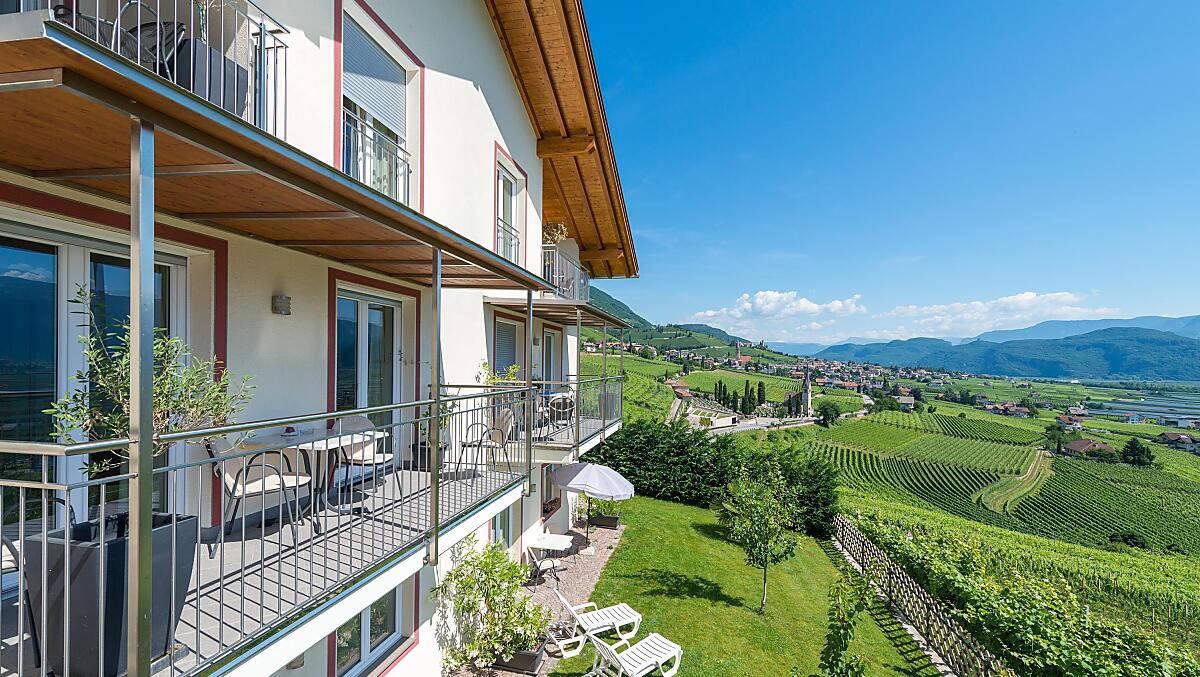 Onze boerderij ligt te midden van onze eigen wijngaarden met Gewürztraminer. Daarnaast produceren wij Weißburgunder, Sauvignon en Vernatsch. We leveren de druiven aan een klein familiebedrijf. Het grootste landbouwonderdeel is de appelproductie. Sinds de bouw van de boerderij in 2011 bieden wij onze gasten vier comfortabele vakantiewoningen met een prachtig panoramisch uitzicht over het Zuid-Tiroolse Unterland.