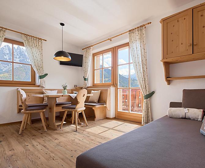 De boerderij ligt op een unieke plek aan de mooiste zijde van de zonkant van Innichen, op 1.340 meter hoogte. Van hieruit geniet u van een vrij uitzicht op de imposante Dolomieten en het historische dorp Innichen.