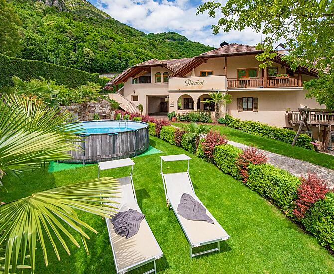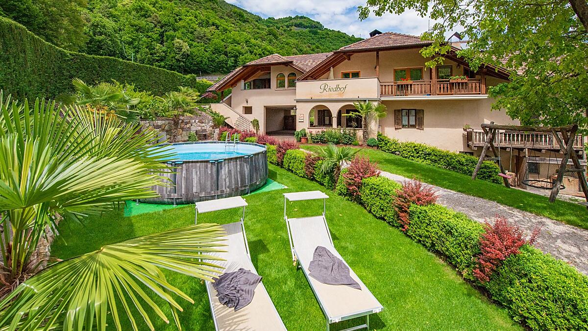De Riedhof ligt in het prachtige Zuid-Tiroler zuiden, in Kurtatsch, op 600 meter boven zeeniveau. Omgeven door onze wijngaarden met Müller-Thurgau en Sauvignon druiven, biedt onze verzorgde boerderij verschillende zit- en ontspanningsplaatsen, evenals een eigen barbecuehoek onder het groene prieel. Voor de kinderen is er een speelplaats en een klein zwembad om af te koelen en te genieten tijdens de zomermaanden. Bij de boerderij hoort ook onze tuin met een kruidentuintje.