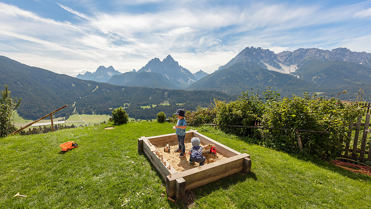 Tegen een achtergrond die zo van een ansichtkaart lijkt te komen, spelen kinderen in Innichen in het Hochpustertal. De natuurlijke speelplek wordt omringd door een indrukwekkend panorama van de Dolomieten.