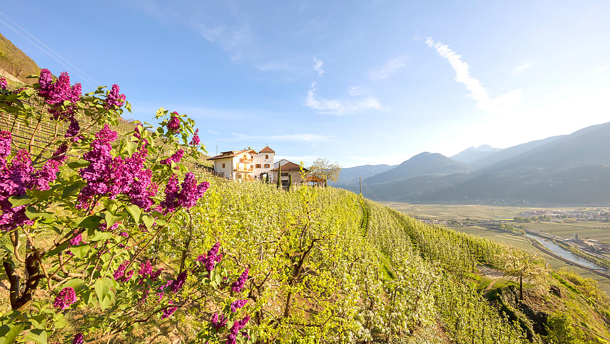 In Meran en omgeving dompel je je in het voorjaar onder in een zee van bloeiende appelbomen. Langs de Etsch lijkt de vallei bedekt met een tere sluier van bloesem.